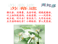 1、人如风后入江云,情似雨余黏地絮。 ----《玉楼春》 2、燎沈香,消溽暑。鸟雀呼晴,侵晓窥檐语。叶上初阳干宿雨,水面清圆,一一风荷举。 故乡遥,何日去?家住吴门,久作长安旅。五月渔郎相忆否。小楫轻舟,梦入芙蓉浦。 ----《苏幕遮·燎沈香》 3、《六丑...