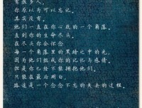 06-16 1、要谢谢时光,谢谢命运,谢谢所有让我们快乐或痛苦的人与事—— 黄昏无霞,何以为黄昏。 青春无你,何以为青春。 ----《被窝是青春的坟墓》 2、但是每个人在这个世界上忙着生,忙着死,所有人都是如此窘迫的状态,令我不忍在向别人索求关怀,如果期待给予绝...