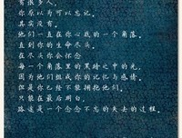 12-03 1、我是个无法甘于安居一地的人 ----《灯下尘》 2、人生百态,犹如四海归帆,自古路远马亡,殊途同归。 陌路尽头,撒去一杯惨淡暗白的骨灰,有多少淡薄的人情能够留得住厚养薄葬的遗憾,在悲郁的挽歌的尾音上,给这尊尊沉默的青碑下孤孑的魂灵叩一首至情至义...